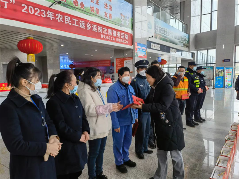 在雅安市汽車客運站,李蓉調(diào)研了工會系統(tǒng)2023年農(nóng)民工返鄉(xiāng)返崗志愿服務活動開展情況,看望慰問了民警、汽車客運站職工、保安保潔等春運一線人員,向大家致以新春祝福。李蓉要求,全市各級工會組織要統(tǒng)籌資源、精心組織,認真做好送溫暖、農(nóng)民工返鄉(xiāng)返崗志愿服務活動等工作,切實把黨和政府的關心關懷與工會組織的溫暖送到廣大職工群眾心坎上。