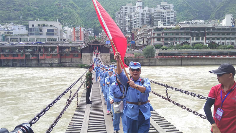 活動中,全體黨員干部職工換上紅軍服、戴上紅軍帽,走上瀘定橋,觸摸著沾染了無數(shù)革命烈士鮮血的鐵索,瞬間將大家的思緒拉回到1935年的5月29日,22名勇士冒著敵人的槍林彈雨,攀著鐵鏈沖向?qū)Π,英勇奪下瀘定橋,取得長征中的一次決定性勝利場景。大家無不被革命先輩的英勇與無畏所震撼。
