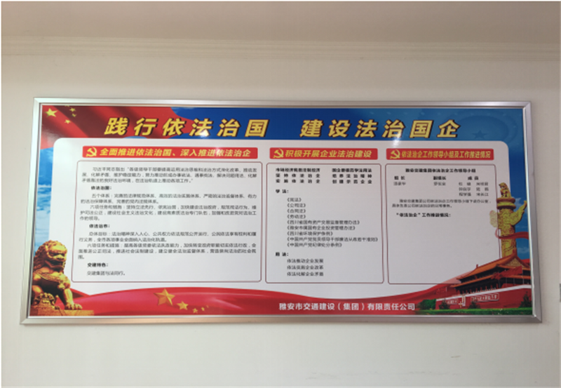 三是印發(fā)《雅安市交通建設(shè)(集團)有限責任公司依法治企法律法規(guī)文件匯編》至公司領(lǐng)導班子成員與高管,作為會前學法材料與自學材料;制作依法治企宣傳展板,懸掛于公司內(nèi)部進行法治宣傳工作。