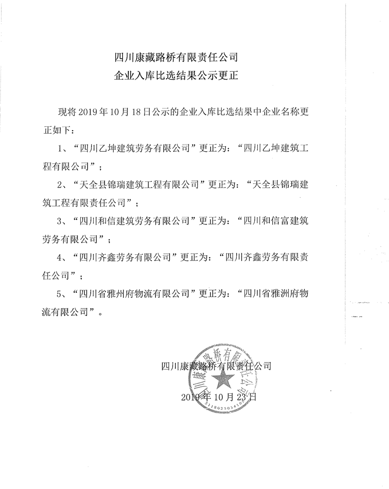 四川康藏路橋有限責任公司企業(yè)入庫比選結果公示更正
