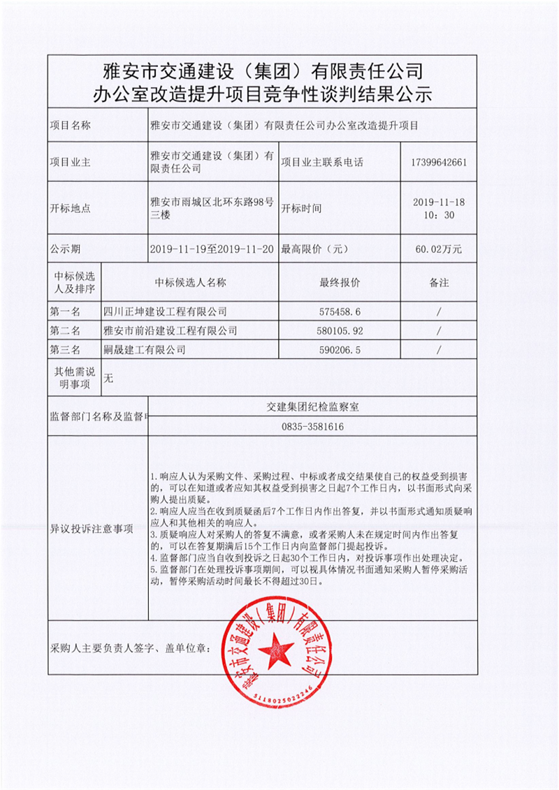 雅安市交通建設(shè)(集團(tuán))有限責(zé)任公司辦公室改造提升項(xiàng)目競爭性談判結(jié)果公示