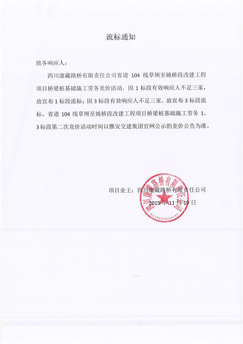 四川康藏路橋有限責任公司省道104線草壩至姚橋段改建工程項目橋梁樁基礎施工勞務競價(1標段、3標段)流標通知