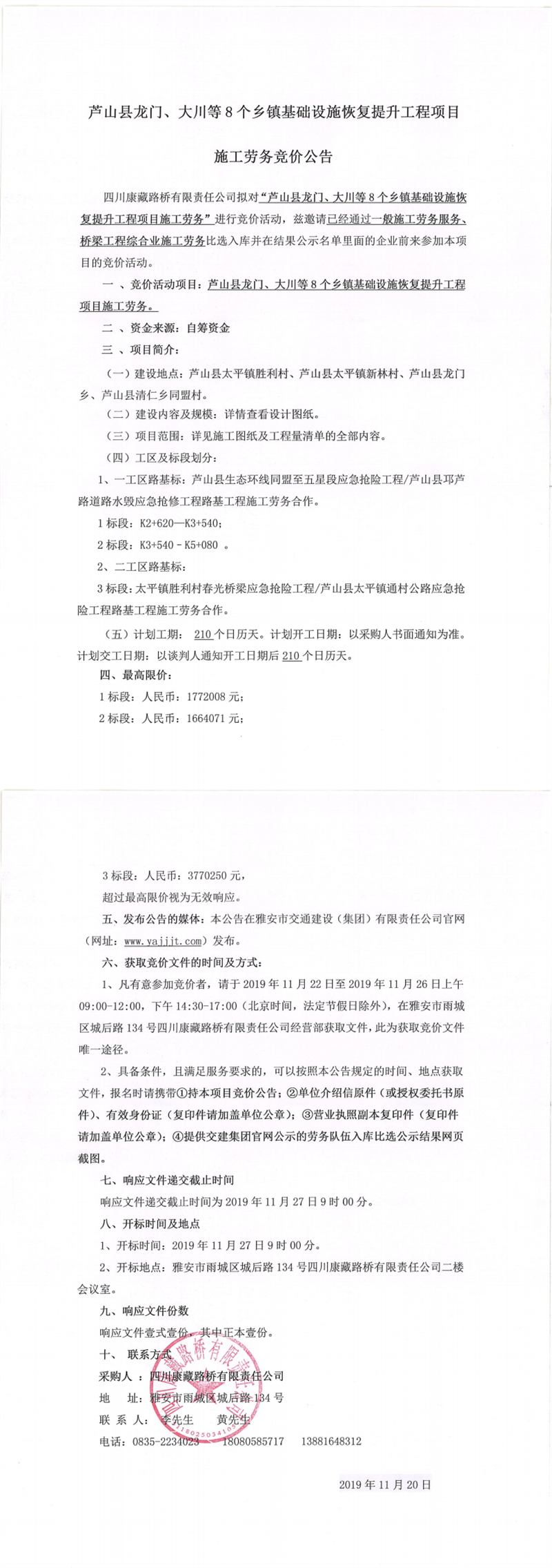 四川康藏路橋有限責(zé)任公司蘆山縣龍門、大川等8個鄉(xiāng)鎮(zhèn)基礎(chǔ)設(shè)施恢復(fù)提升工程項目施工勞務(wù)競價公告