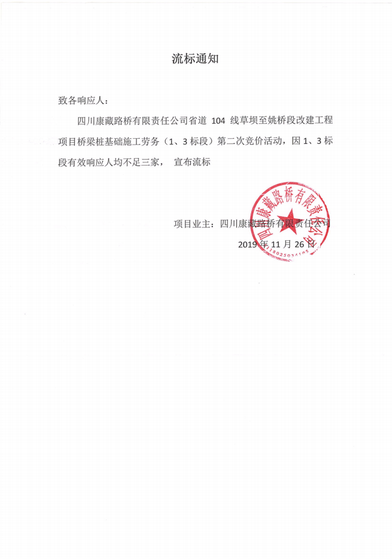 四川康藏路橋有限責(zé)任公司省道104線草壩至姚橋段改建工程項目橋梁樁基礎(chǔ)(1、3標(biāo)段)施工勞務(wù)競價(第二次)流標(biāo)通知