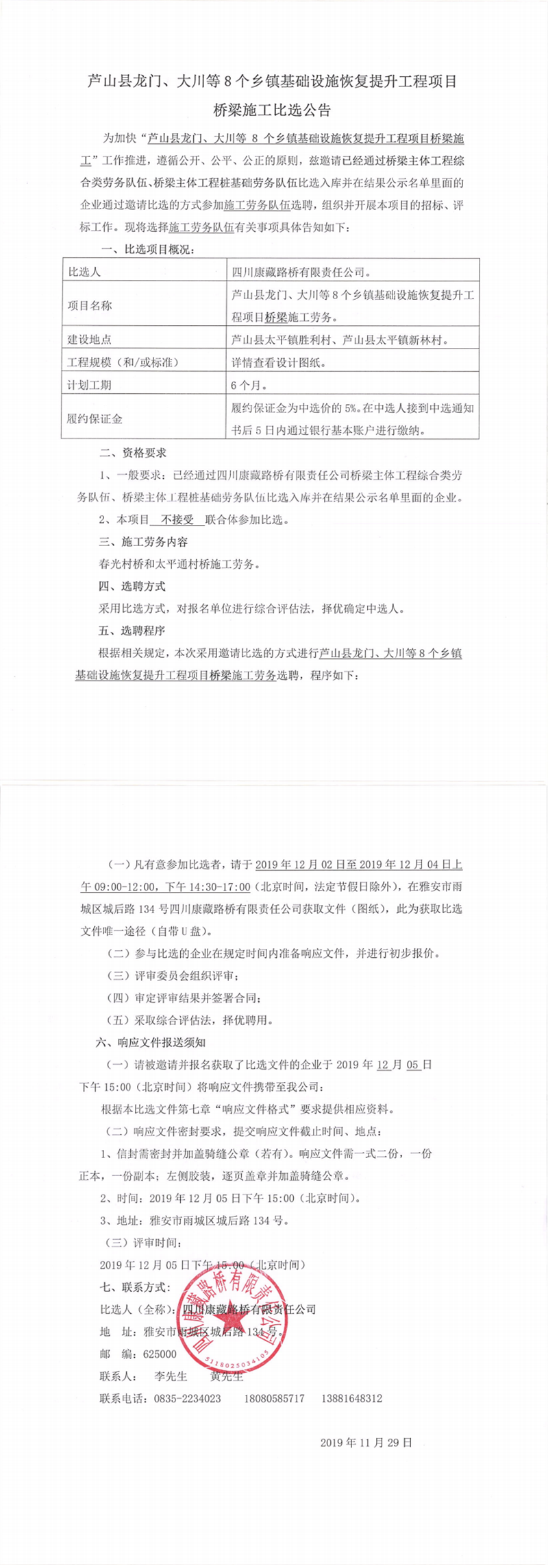 四川康藏路橋有限責(zé)任公司蘆山縣龍門、大川等8個(gè)鄉(xiāng)鎮(zhèn)基礎(chǔ)設(shè)施恢復(fù)提升工程項(xiàng)目施工勞務(wù)競價(jià)結(jié)果公示