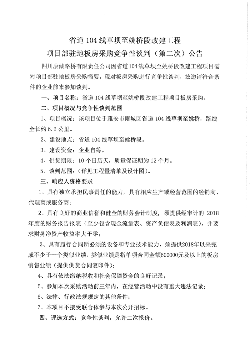 四川康藏路橋有限責(zé)任公司省道104線草壩至姚橋段改建工程項(xiàng)目部駐地板房采購(gòu)競(jìng)爭(zhēng)性談判(第二次)公告