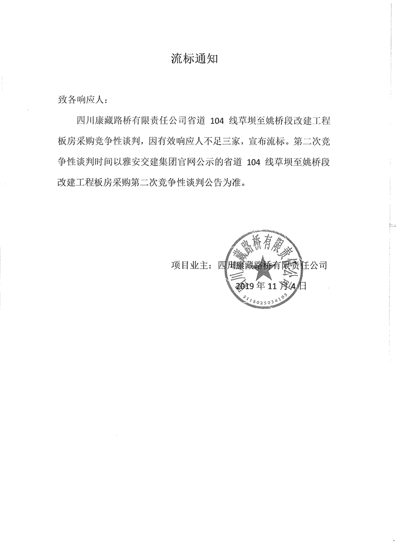 四川康藏路橋有限責(zé)任公司省道104線草壩至姚橋段改建工程板房采購項目流標通知