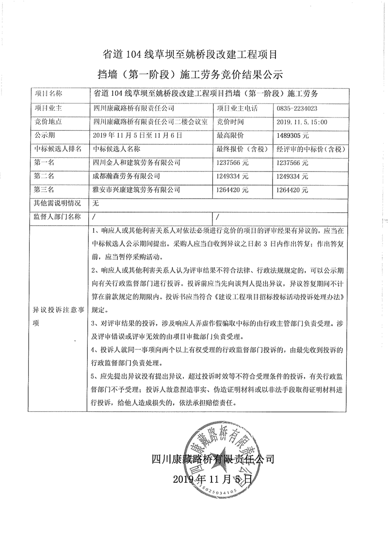 四川康藏路橋有限責任公司省道104線草壩至姚橋段改建工程項目擋墻(第一階段)施工勞務(wù)競價結(jié)果公示