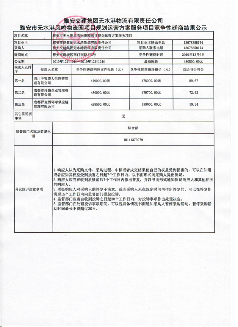 雅安交建集團無水港物流有限責任公司雅安市無水港鳳鳴物流園項目規(guī)劃運營方案服務項目競爭性磋商結果公示