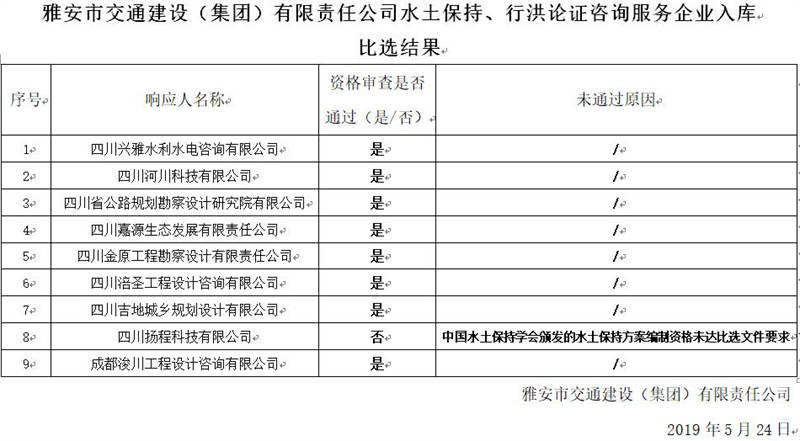 雅安市交通建設(shè)(集團(tuán))有限責(zé)任公司水土保持、行洪論證咨詢服務(wù)企業(yè)入庫(kù)比選結(jié)果公示