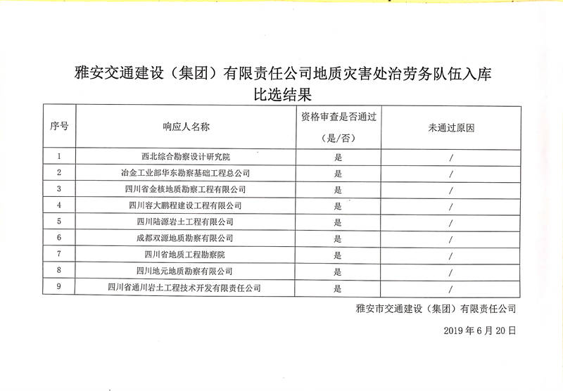 雅安交通建設(shè)(集團)有限責(zé)任公司地質(zhì)災(zāi)害處治勞務(wù)隊伍入庫比選結(jié)果