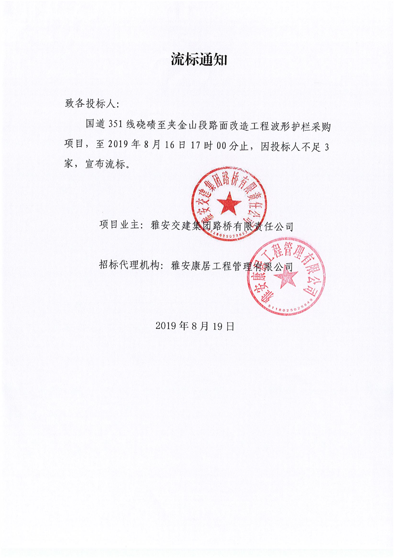 雅安交建集團路橋有限責任公司國道351線磽磧至夾金山段路面改造工程波形護欄采購項目流標通知