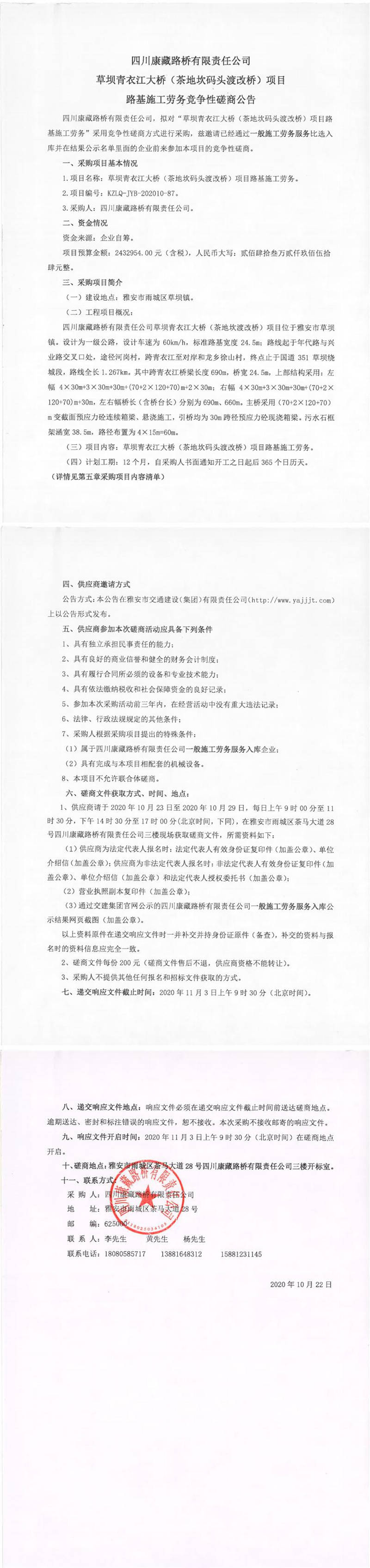 四川康藏路橋有限責(zé)任公司草壩青衣江大橋(茶地坎碼頭渡改橋)項目路基施工勞務(wù)競爭性磋商公告
