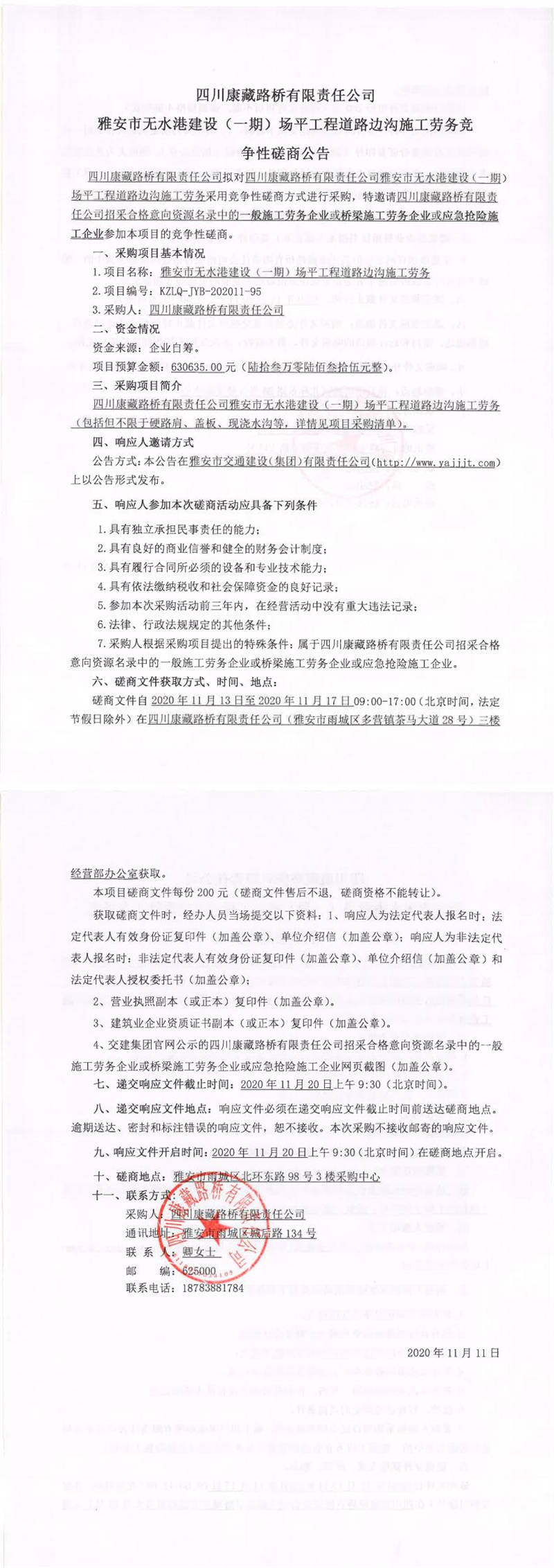 四川康藏路橋有限責任公司雅安市無水港建設(一期)場平工程道路邊溝施工勞務競爭性磋商公告