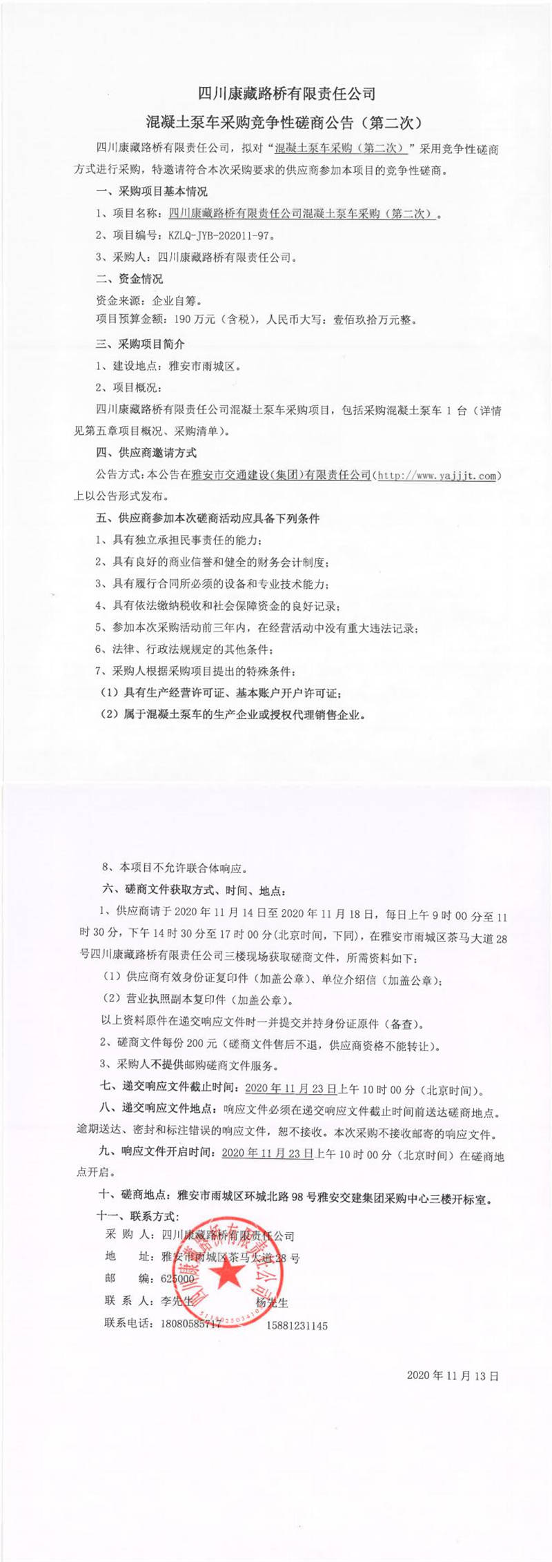 四川康藏路橋有限責任公司混凝土泵車采購競爭性磋商公告(第二次)