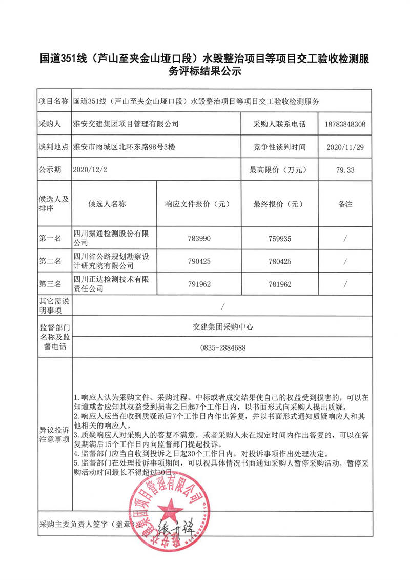 雅安交建集團(tuán)項目管理有限公司國道351線(蘆山至夾金山埡口段)水毀整治項目等項目交工驗收檢測服務(wù)評標(biāo)結(jié)果公示