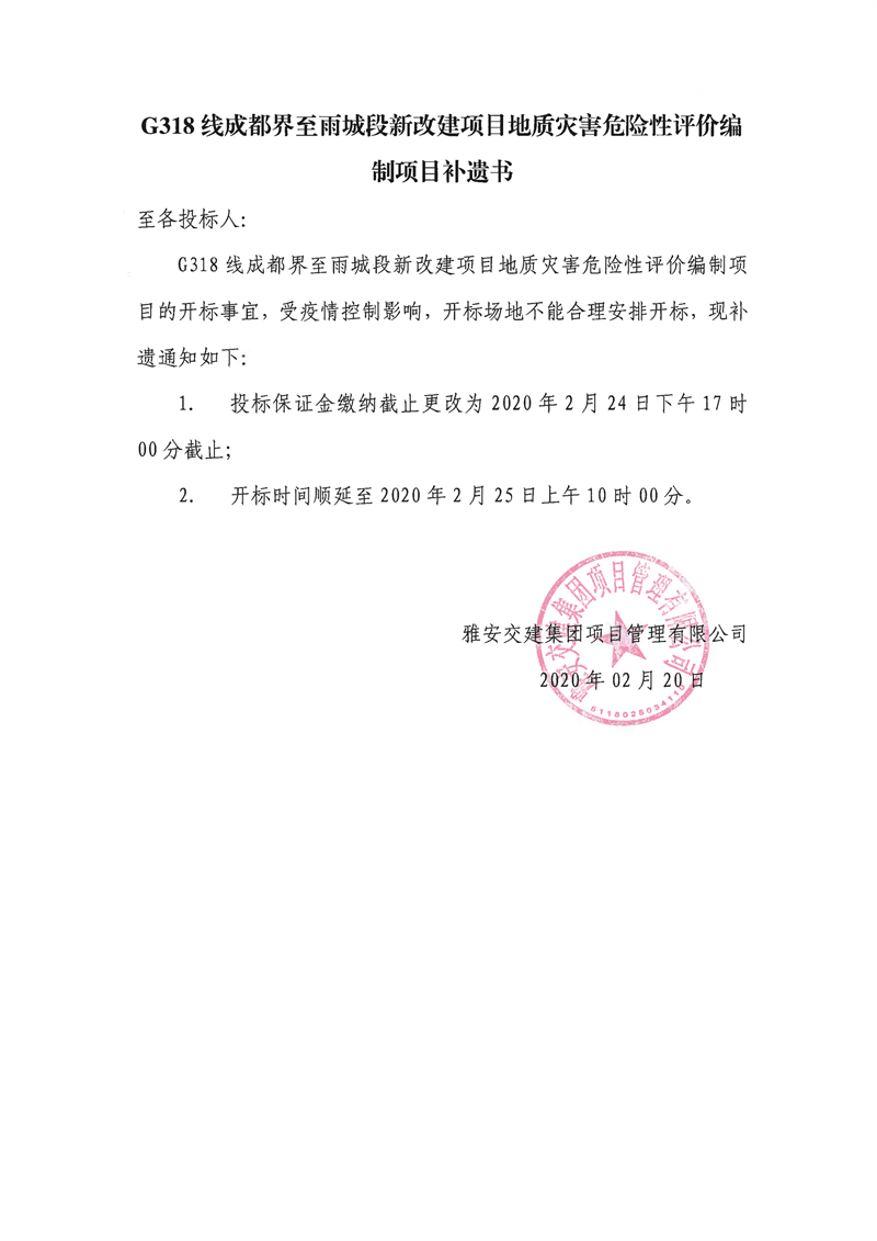 雅安交建集團(tuán)項(xiàng)目管理有限公司G318線成都界至雨城段新改建項(xiàng)目土地預(yù)審資料編制、項(xiàng)目選址意見(jiàn)書(shū)編制項(xiàng)目補(bǔ)遺書(shū)