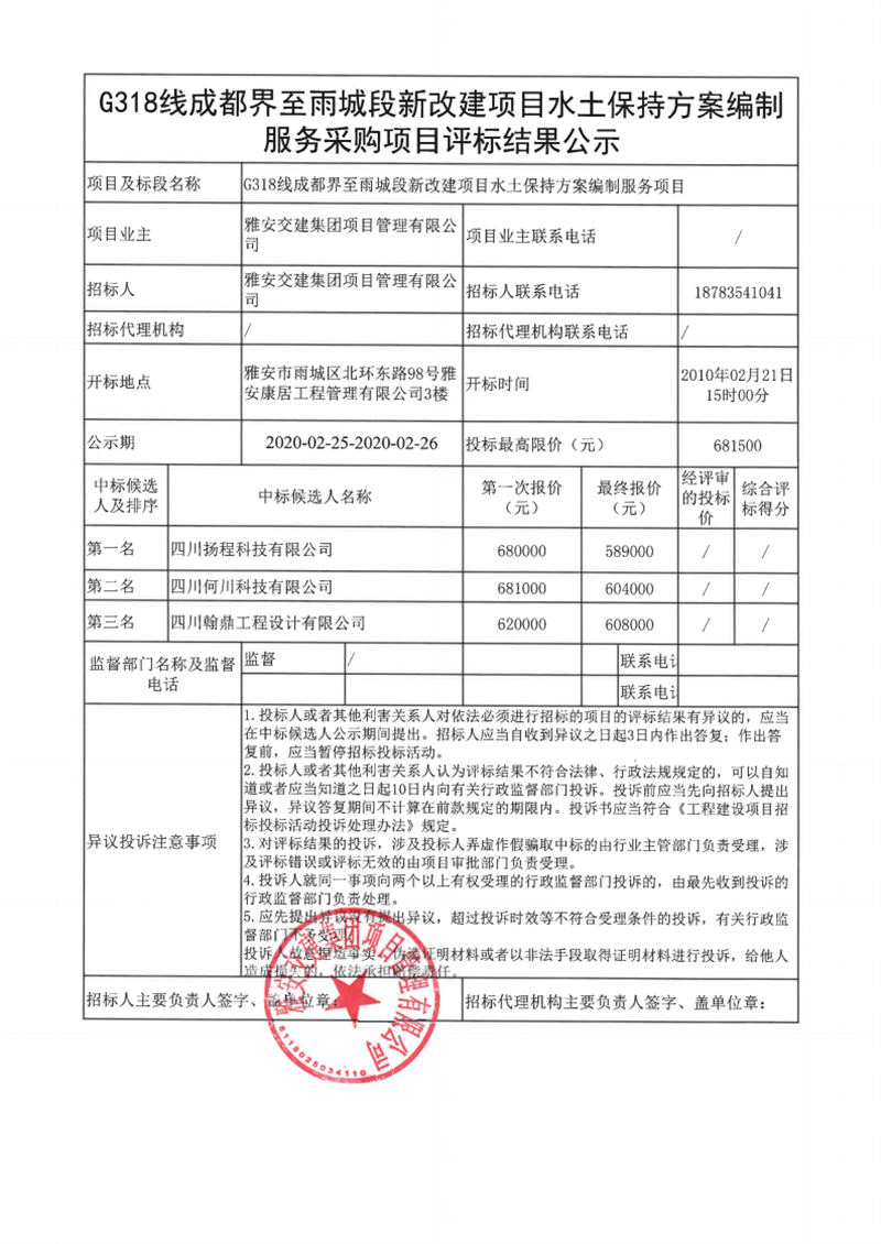 雅安交建集團(tuán)項目管理有限公司G318線成都界至雨城段新改建項目水土保持方案編制服務(wù)采購項目評標(biāo)結(jié)果公示