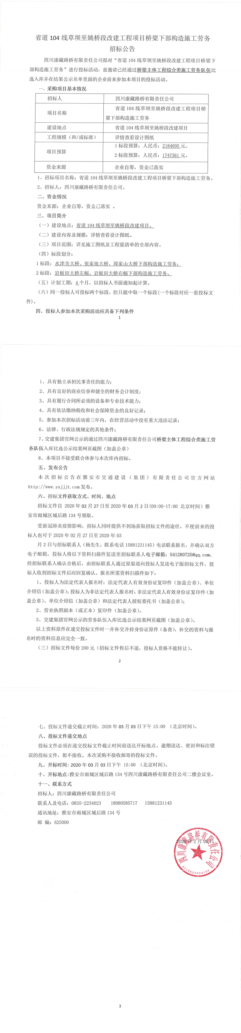 四川康藏路橋有限責(zé)任公司省道104線草壩至姚橋段改建工程項(xiàng)目橋梁下部構(gòu)造施工勞務(wù)招標(biāo)公告
