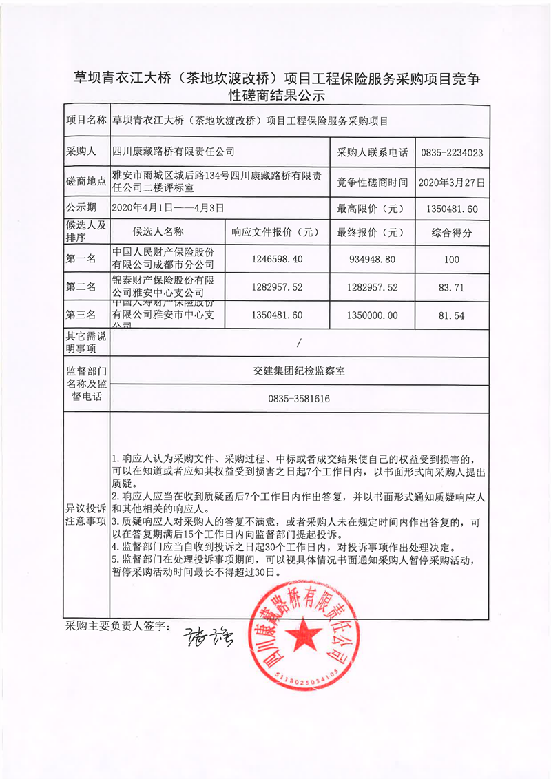 四川康藏路橋有限責(zé)任公司草壩青衣江大橋(茶地坎渡改橋)項(xiàng)目工程保險(xiǎn)服務(wù)采購(gòu)項(xiàng)目競(jìng)爭(zhēng)性磋商結(jié)果公示