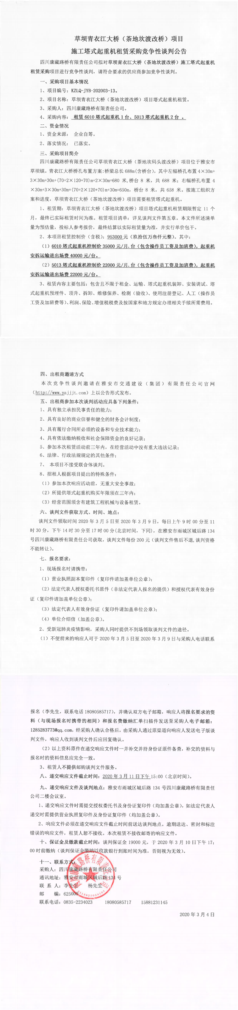 四川康藏路橋有限責任公司草壩青衣江大橋(茶地坎渡改橋)項目施工塔式起重機租賃采購競爭性談判公告