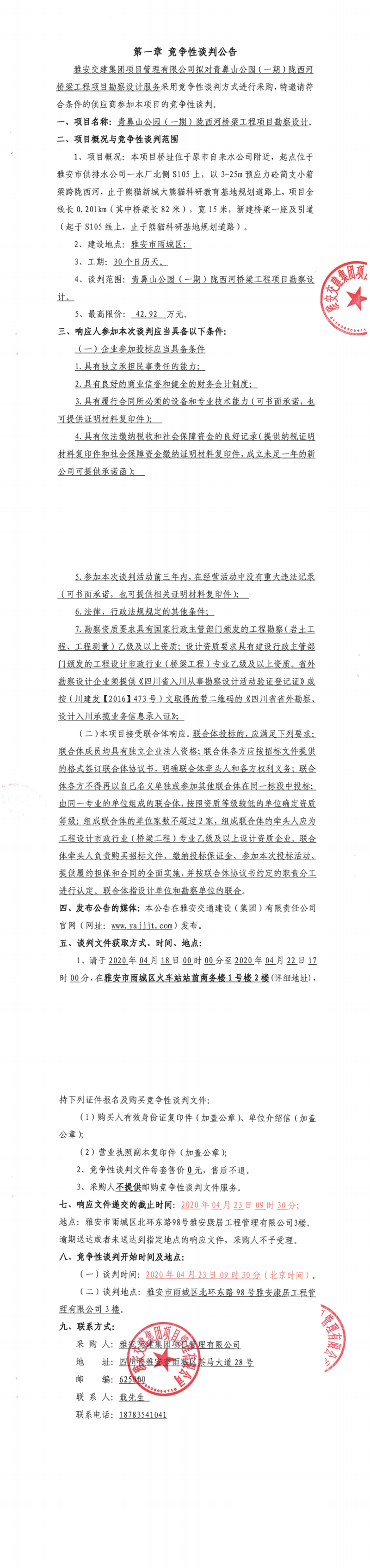 雅安交建集團(tuán)項(xiàng)目管理有限公司青鼻山公園(一期)隴西河橋梁工程項(xiàng)目勘察設(shè)計(jì)競(jìng)爭(zhēng)性談判公告