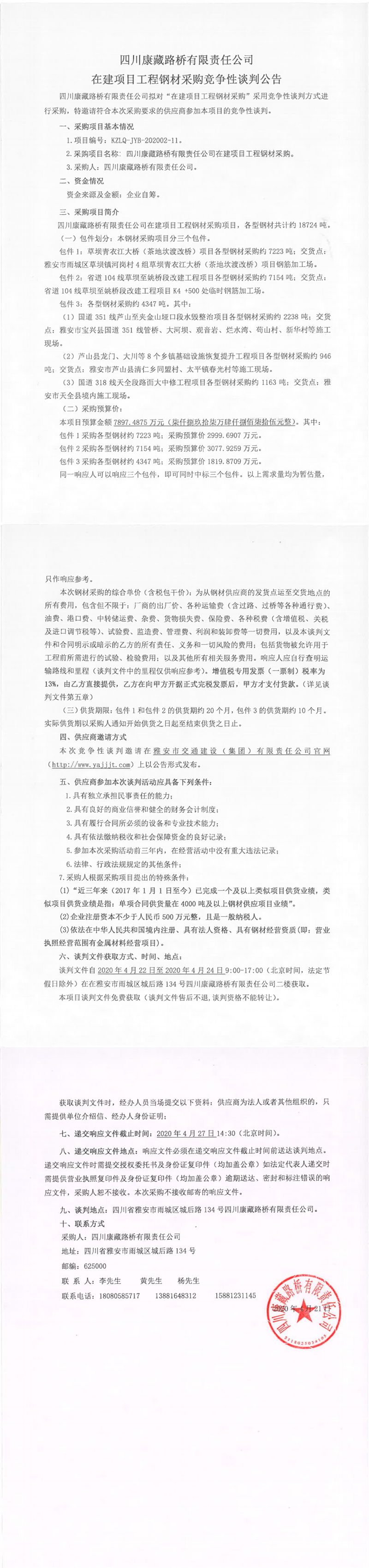 四川康藏路橋有限責(zé)任公司在建項(xiàng)目工程鋼材采購(gòu)競(jìng)爭(zhēng)性談判公告