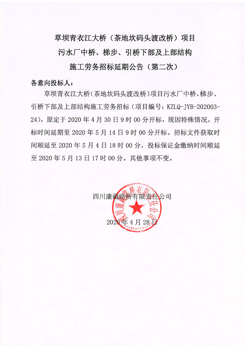 四川康藏路橋有限責(zé)任公司草壩青衣江大橋(茶地坎碼頭渡改橋)項(xiàng)目污水廠中橋、梯步、引橋下部及上部結(jié)構(gòu)施工勞務(wù)招標(biāo)延期公告(第二次)