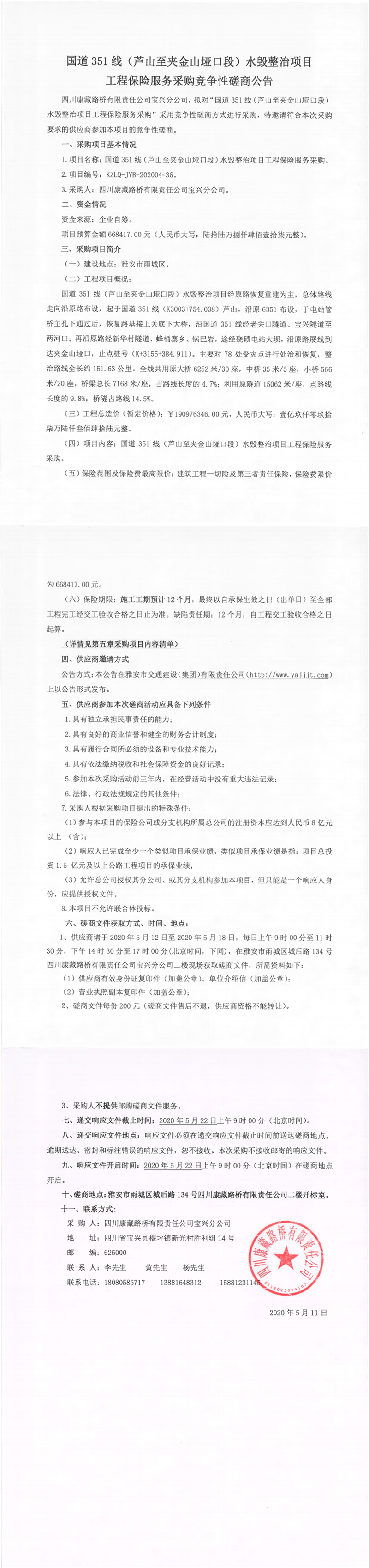 四川康藏路橋有限責(zé)任公司寶興分公司國(guó)道351線(蘆山至夾金山埡口段)水毀整治項(xiàng)目工程保險(xiǎn)服務(wù)采購(gòu)競(jìng)爭(zhēng)性磋商公告
