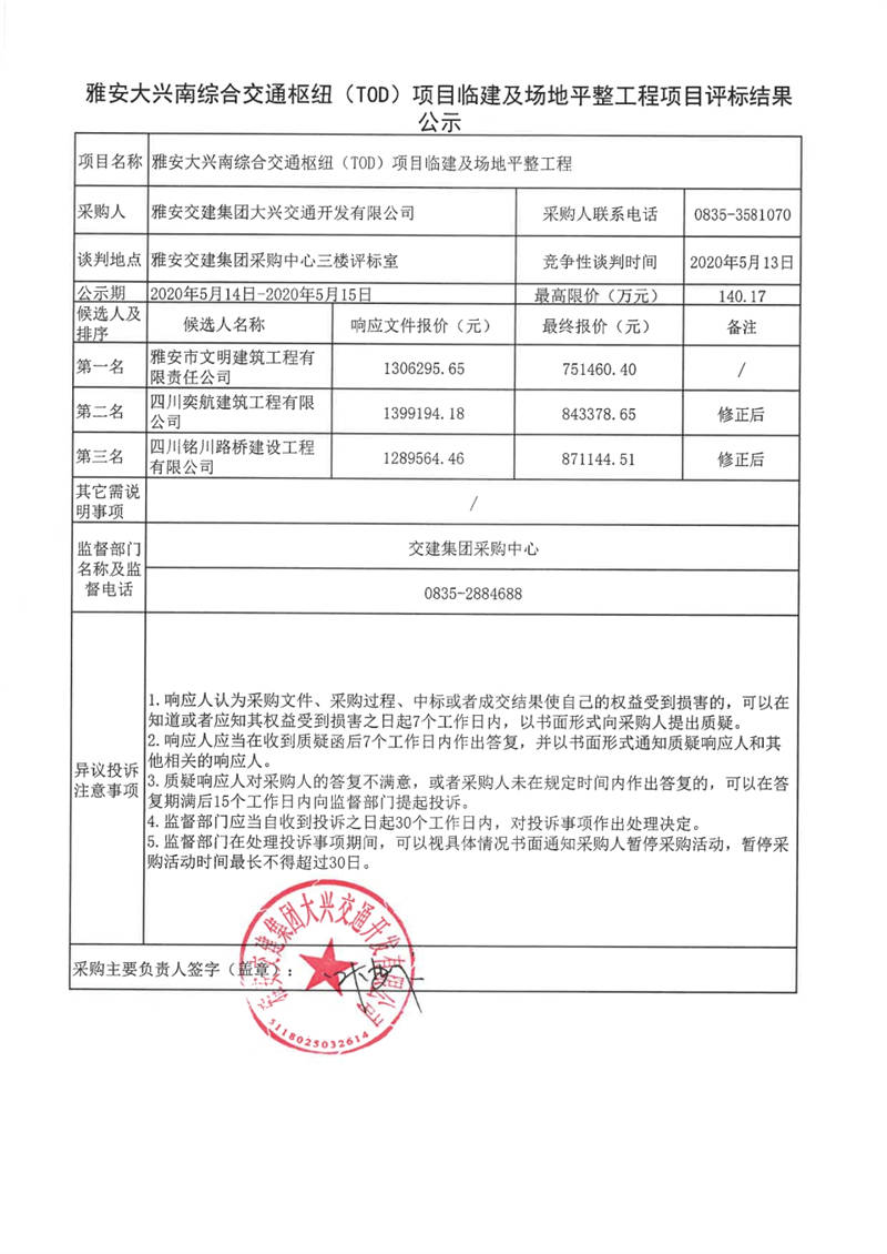 雅安交建集團(tuán)大興交通開發(fā)有限公司雅安大興南綜合交通樞紐(TOD)項(xiàng)目臨建及場(chǎng)地平整工程項(xiàng)目評(píng)標(biāo)結(jié)果公示