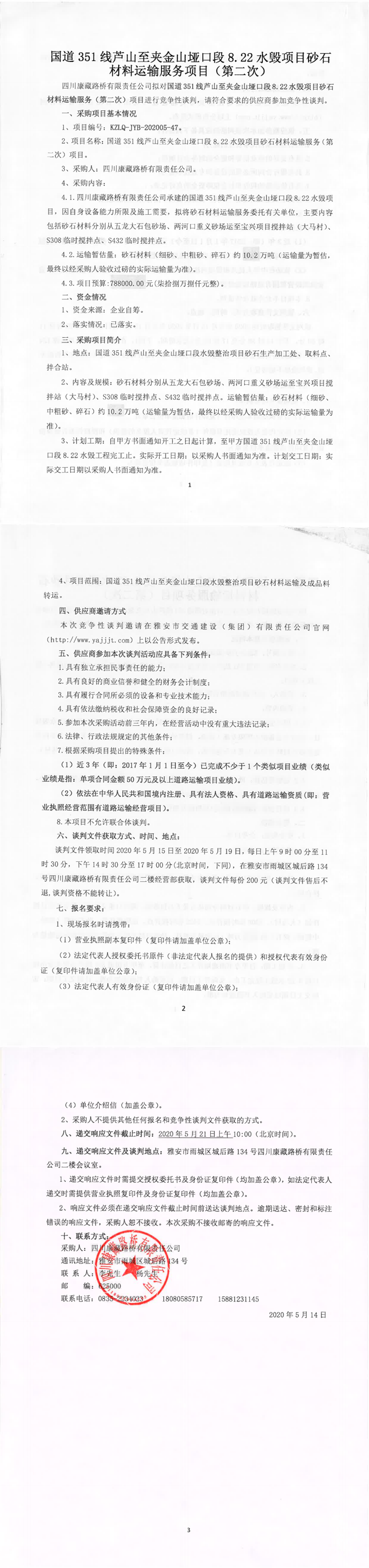 四川康藏路橋有限責(zé)任公司國道351線蘆山至夾金山埡口段8.22水毀項(xiàng)目砂石材料運(yùn)輸服務(wù)項(xiàng)目(第二次)競爭性談判公告