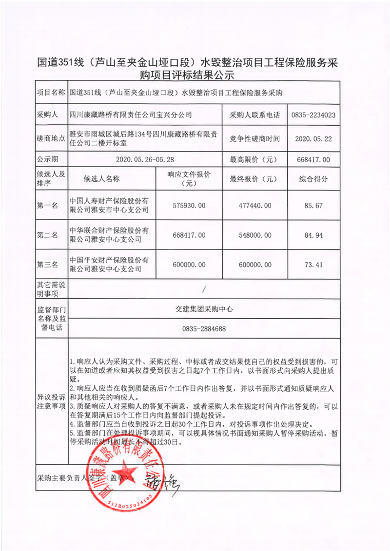 四川康藏路橋有限責(zé)任公司寶興分公司國道351線(蘆山至夾金山埡口段)水毀整治項目工程保險服務(wù)采購項目評標結(jié)果公示