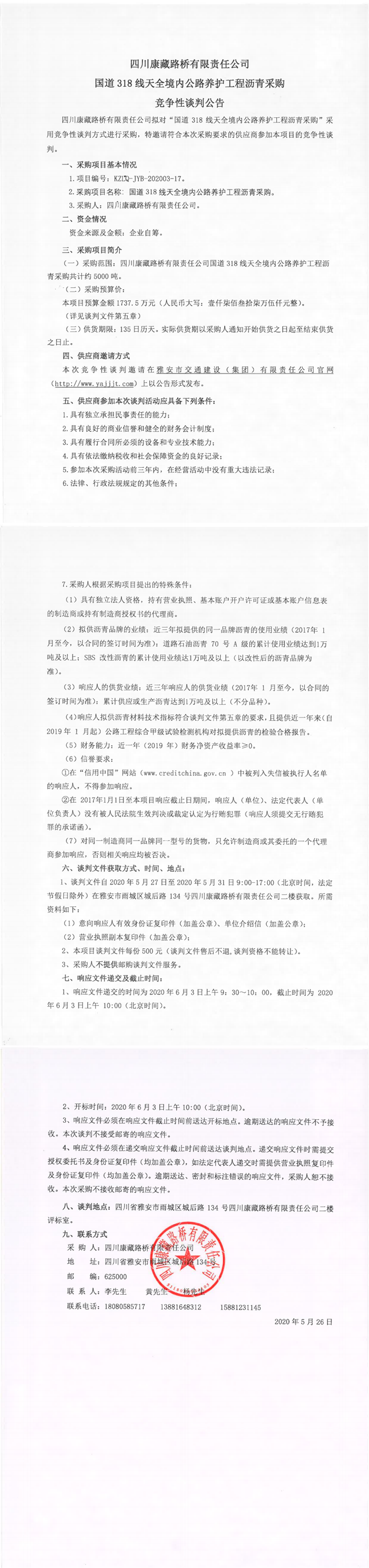四川康藏路橋有限責(zé)任公司國道318線天全境內(nèi)公路養(yǎng)護(hù)工程瀝青采購競爭性談判公告