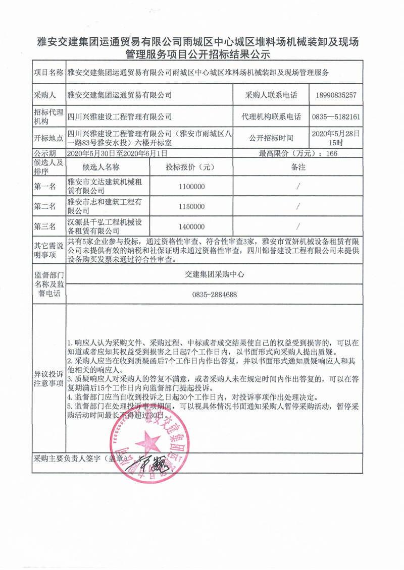 雅安交建集團運通貿(mào)易有限公司雨城區(qū)中心城區(qū)堆料場機械裝卸及現(xiàn)場管理服務(wù)項目公開招標(biāo)結(jié)果公示