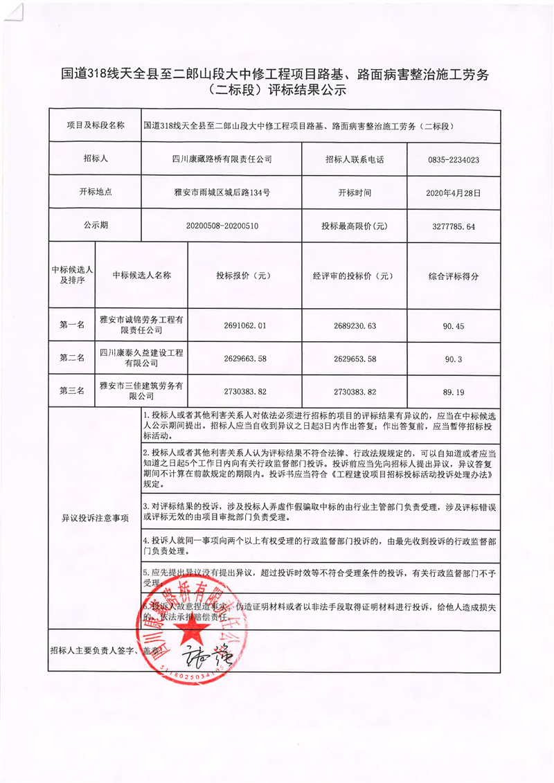 四川康藏路橋有限責(zé)任公司國道318線天全縣至二郎山段大中修工程項(xiàng)目路基、路面病害整治施工勞務(wù)(二標(biāo)段)評(píng)標(biāo)結(jié)果公示