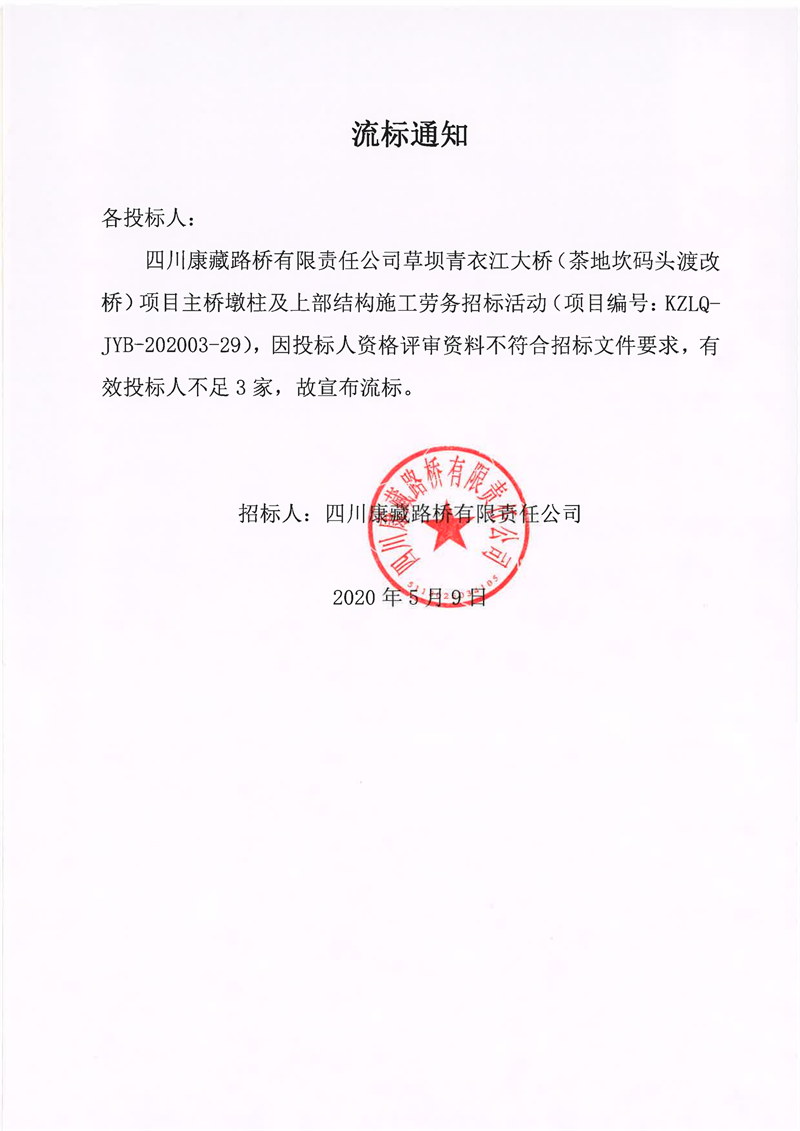四川康藏路橋有限責(zé)任公司草壩青衣江大橋(茶地坎碼頭渡改橋)項目主橋墩柱及上部結(jié)構(gòu)施工勞務(wù)流標(biāo)通知