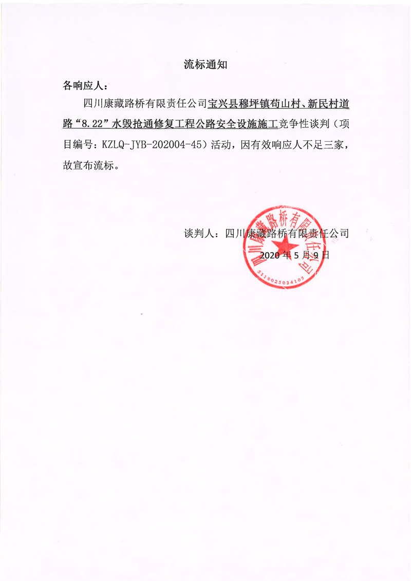 四川康藏路橋有限責(zé)任公司寶興縣穆坪鎮(zhèn)茍山村、新民村道路“8.22”水毀搶通修復(fù)工程公路安全設(shè)施施工競(jìng)爭(zhēng)性談判流標(biāo)通知