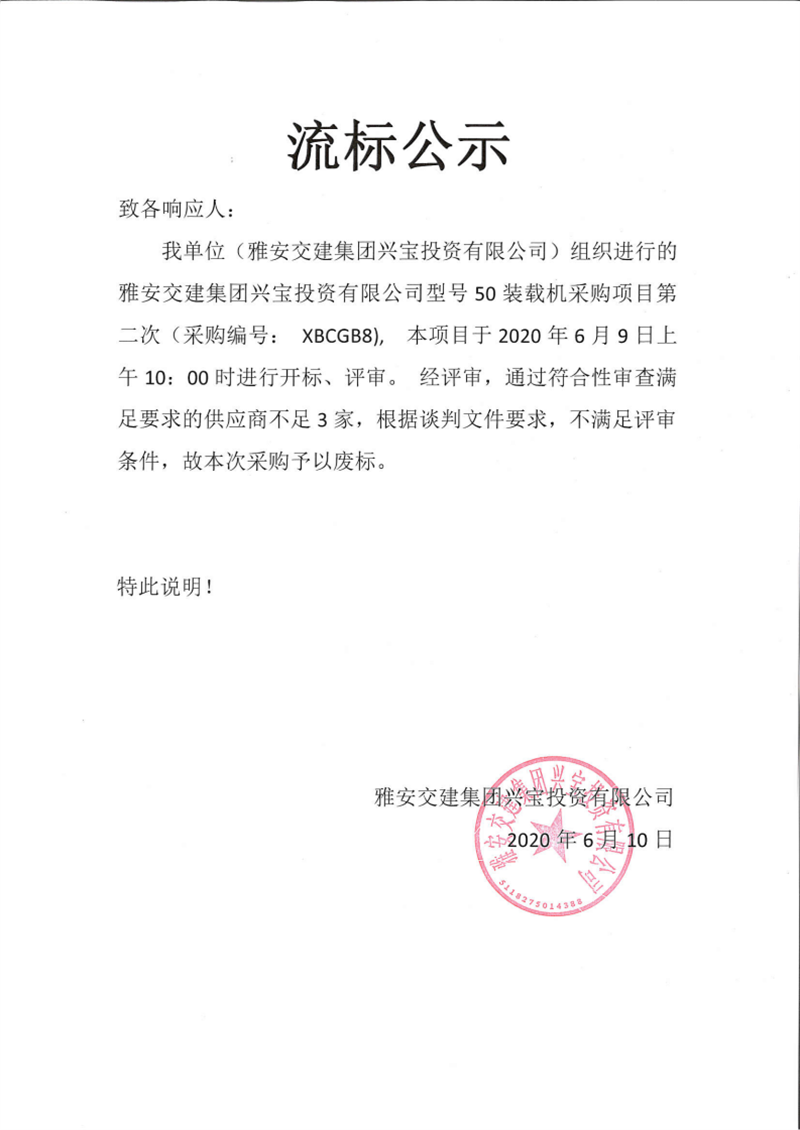 雅安交建集團興寶投資有限公司型號50裝載機采購項目第二次流標公示
