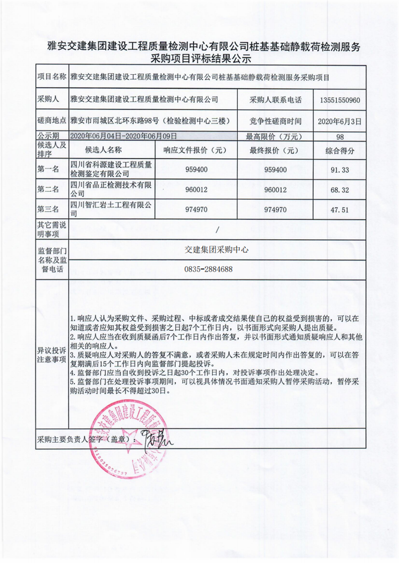 雅安交建集團建設工程質(zhì)量檢測中心有限公司樁基基礎靜載荷檢測服務采購項目評標結果公示