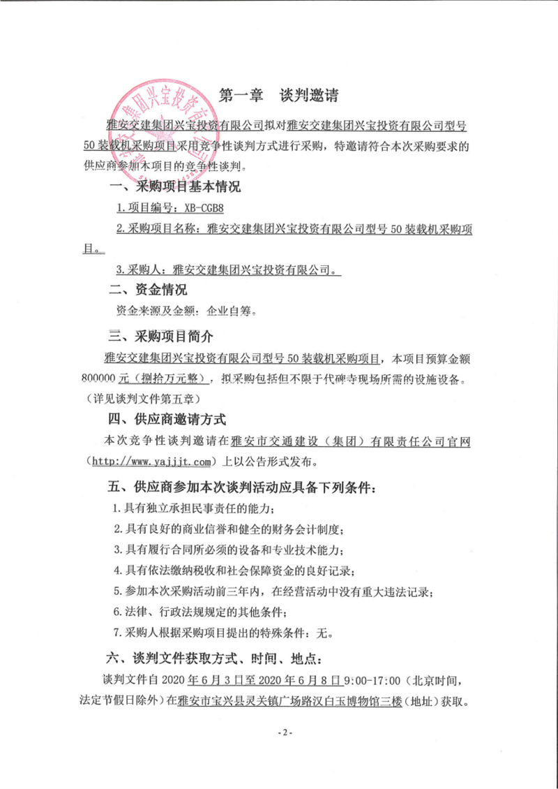 雅安交建集團興寶投資有限公司型號50裝載機采購項目(第二次)競爭性談判公告