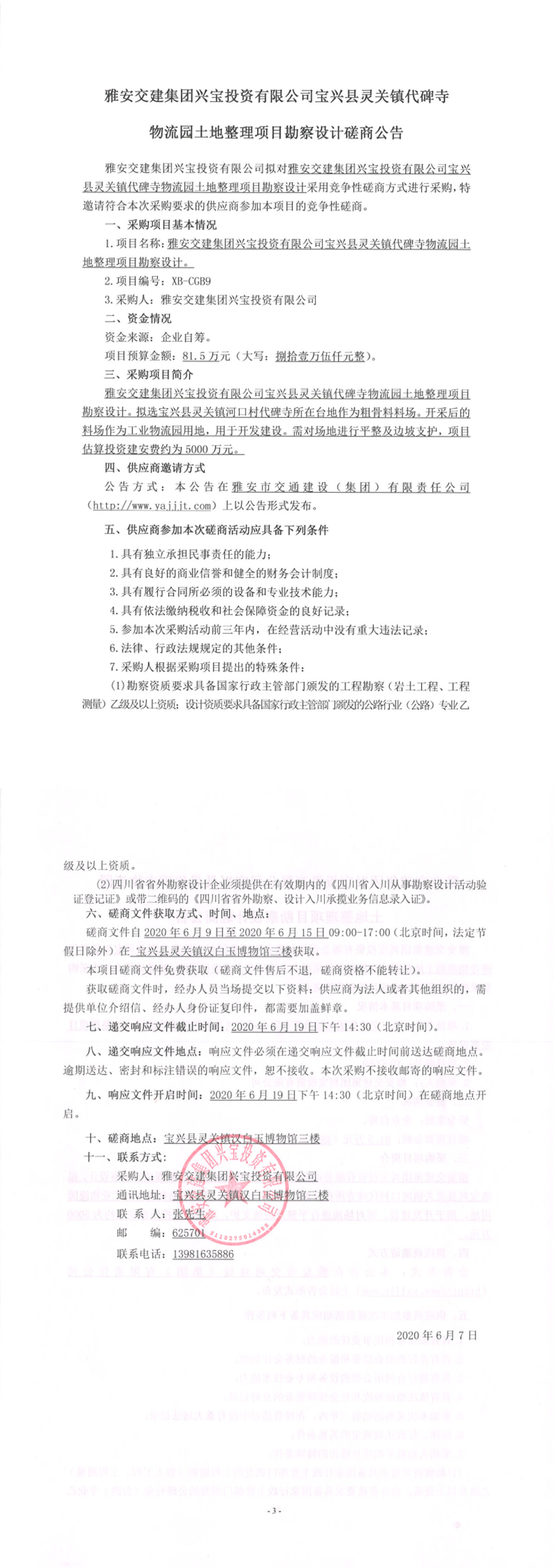 雅安交建集團興寶投資有限公司寶興縣靈關鎮(zhèn)代碑寺物流園土地整理項目勘察設計競爭性磋商公告