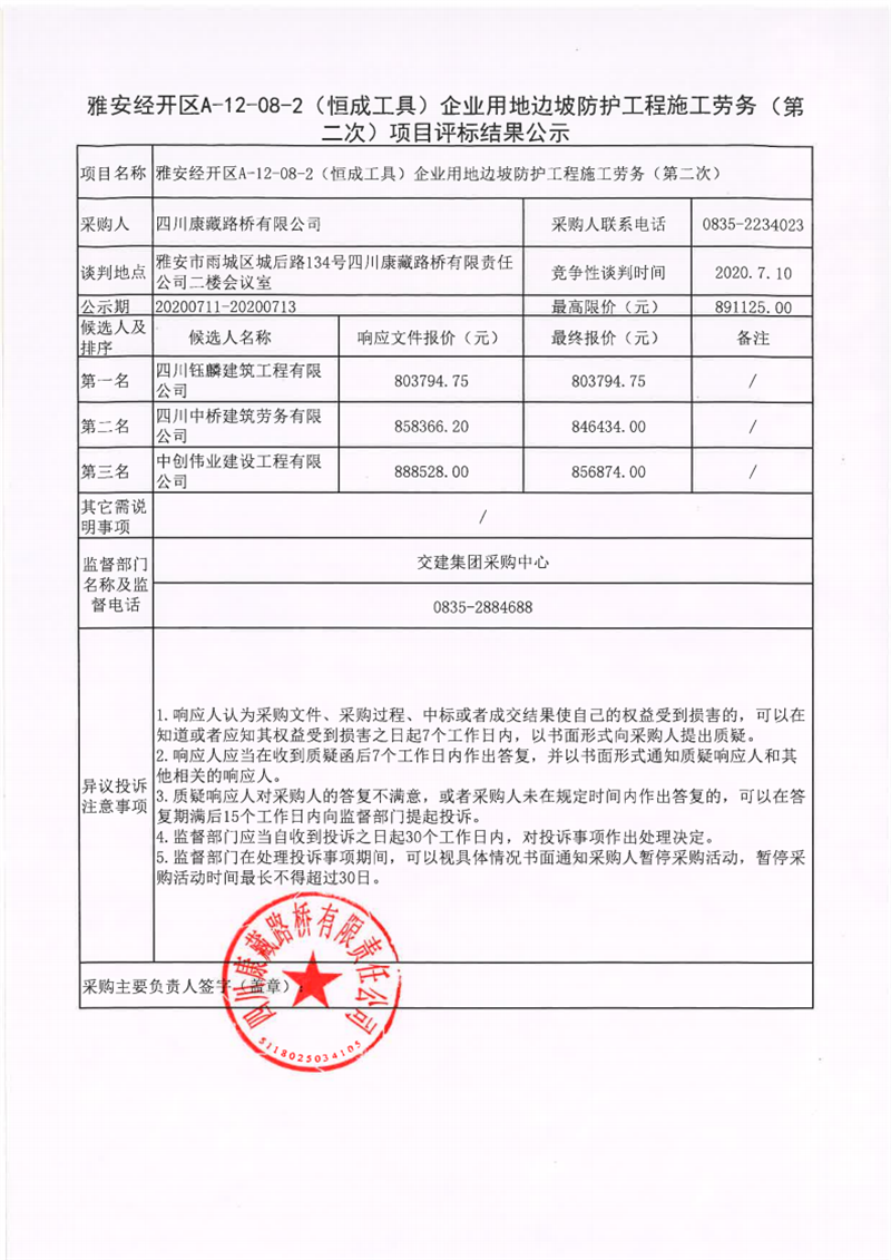 四川康藏路橋有限公司雅安經(jīng)開區(qū)A-12-08-2(恒成工具)企業(yè)用地邊坡防護工程施工勞務(wù)(第二次)項目評標結(jié)果公示