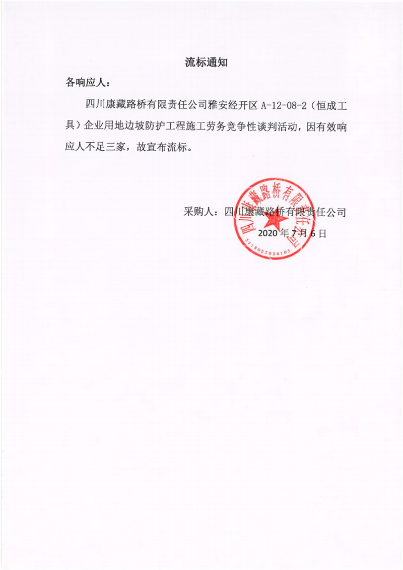 四川康藏路橋有限責(zé)任公司雅安經(jīng)開區(qū)A-12-08-2(恒成工具)企業(yè)用地邊坡防護(hù)工程施工勞務(wù)流標(biāo)通知