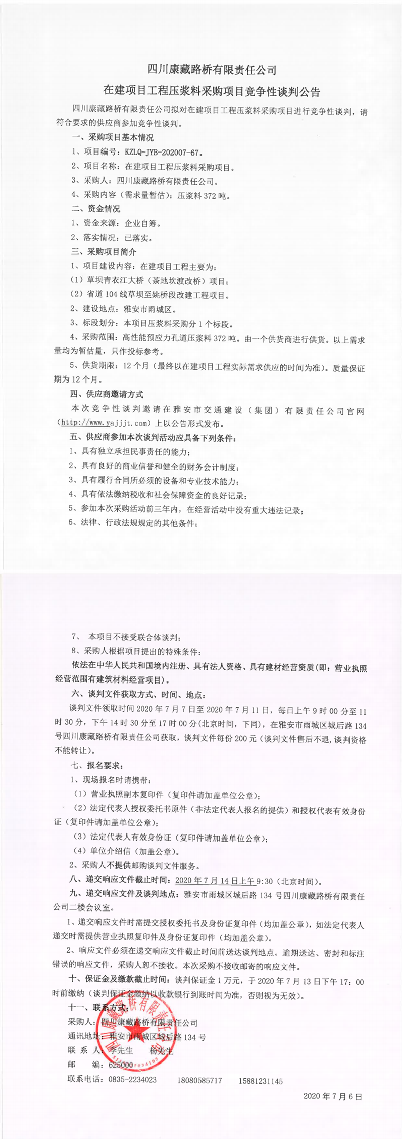 四川康藏路橋有限責(zé)任公司在建項目工程壓漿料采購項目競爭性談判公告