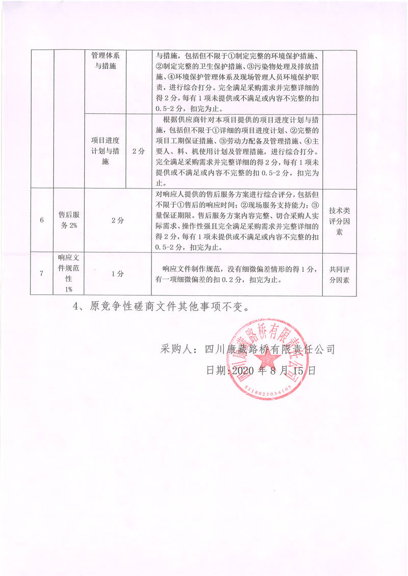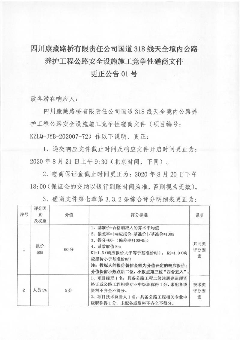 四川康藏路橋有限責(zé)任公司國道318線天全境內(nèi)公路養(yǎng)護工程公路安全設(shè)施施工競爭性磋商文件更正公告01號