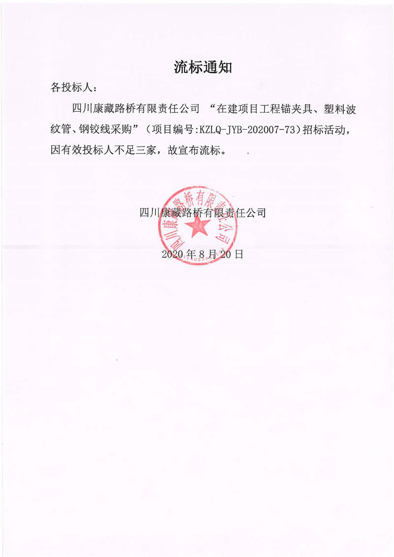 四川康藏路橋有限責任公司在建項目工程錨夾具、塑料波紋管、鋼鉸線采購流標通知
