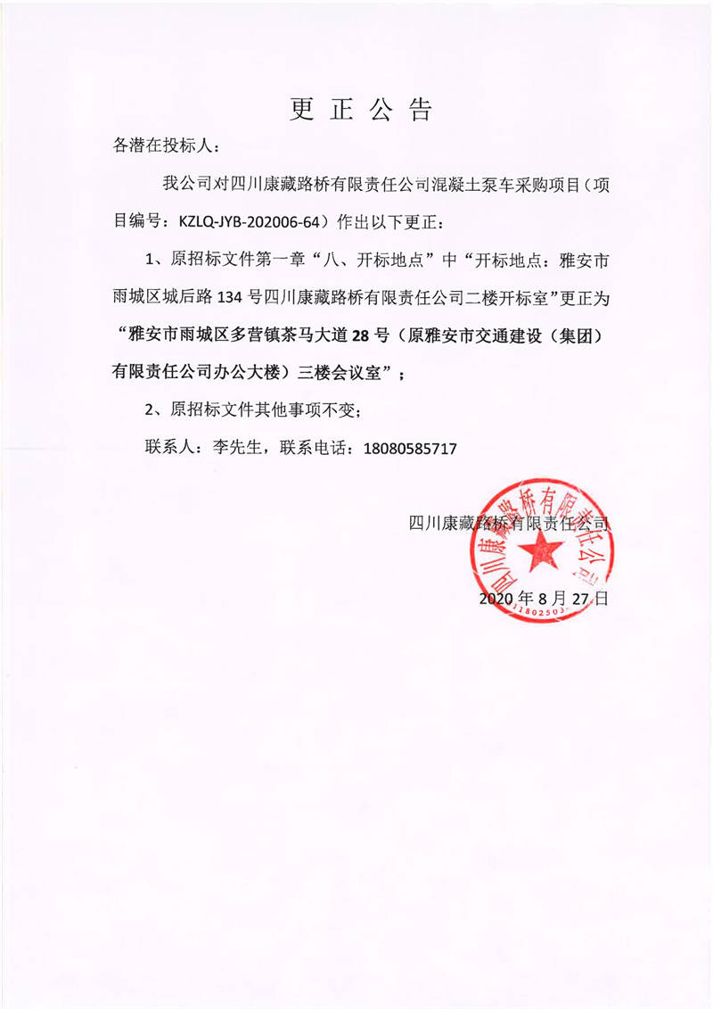 四川康藏路橋有限責(zé)任公司混凝土泵車采購(gòu)項(xiàng)目更正公告