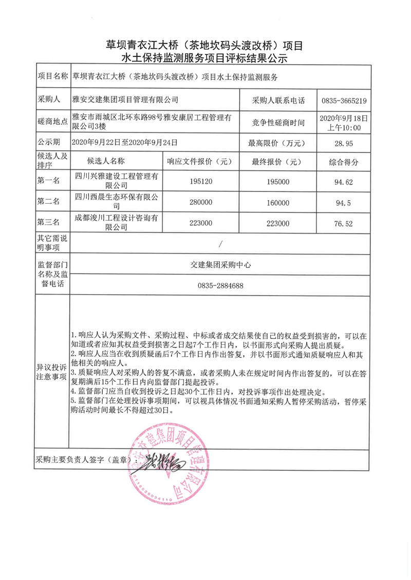 雅安交建集團項目管理有限公司草壩青衣江大橋(茶地坎碼頭渡改橋)項目水土保持監(jiān)測服務項目評標結(jié)果公示