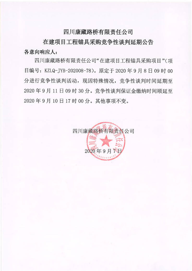 四川康藏路橋有限責(zé)任公司在建項目工程錨具采購競爭性談判延期公告