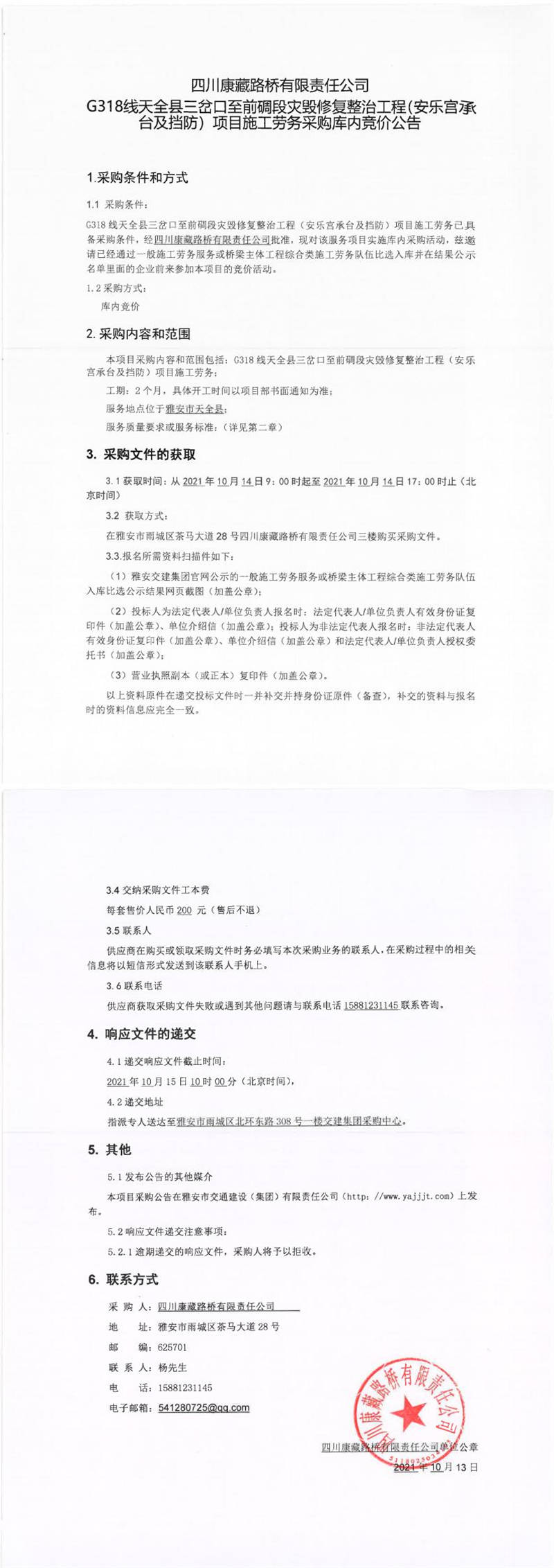 四川康藏路橋有限責(zé)任公司G318線天全縣三岔口至前碉段災(zāi)毀修復(fù)整治工程(安樂宮承臺及擋防)項目施工勞務(wù)采購庫內(nèi)競價公告